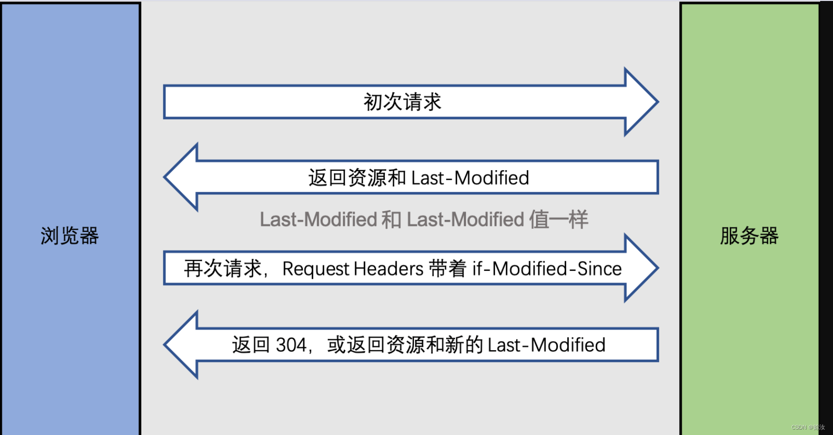 Last-Modified: 服务端拿到 if-Modified-Since 之后拿这个时间去和服务端资源最后修改时间做比较,如果一致则返回 304 ,不一致(也就是资源已经更新了)就返回 200 和新的资源及新的 Last-Modified。